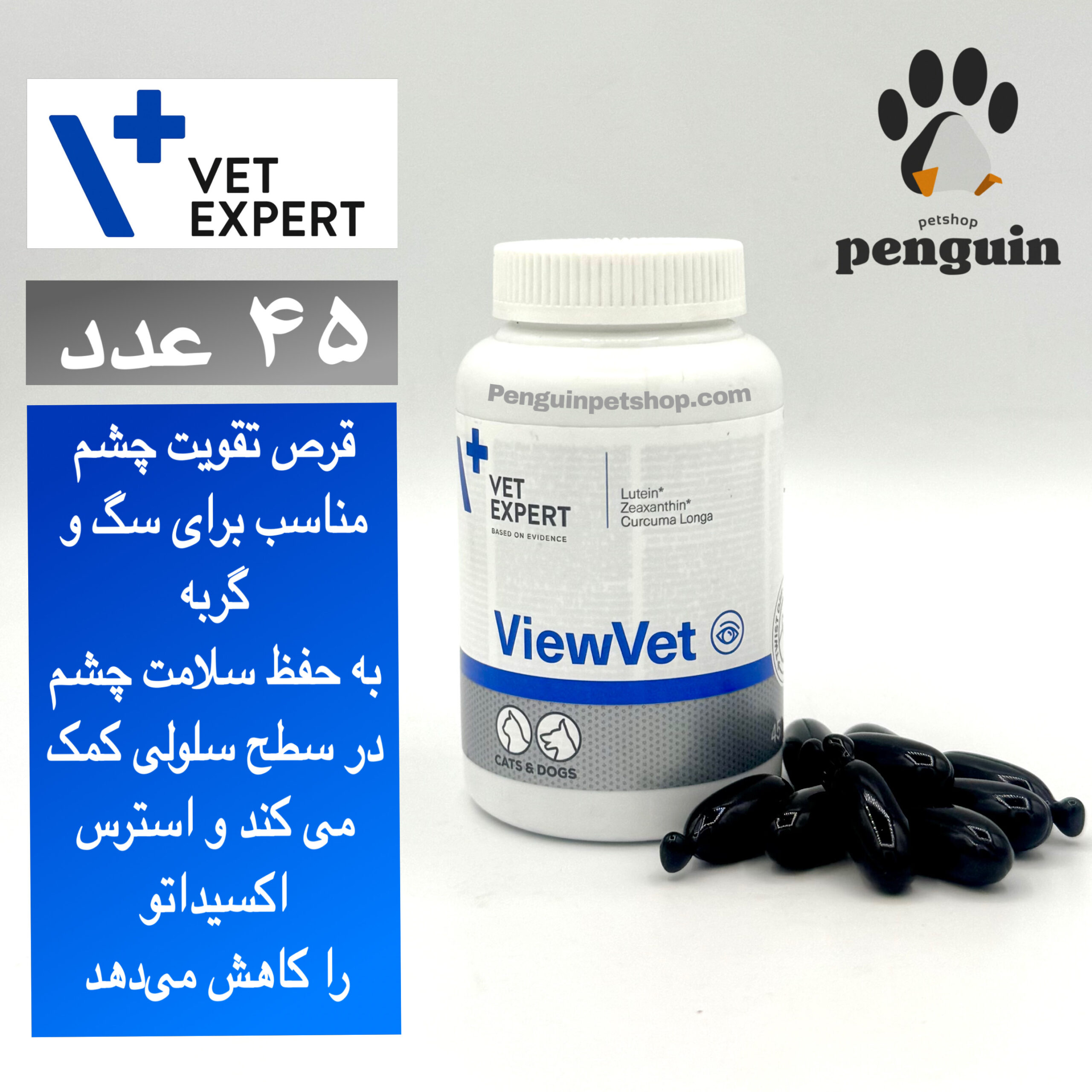 قرص ViewVet وت اکسپرت (Vet Expert) یک مکمل تخصصی برای حمایت از سلامت چشم و حفظ عملکرد بینایی در سگ و گربه است. این محصول با ترکیبات آنتیاکسیدانی و مواد مغذی مؤثر، به محافظت از سلولهای چشمی در برابر استرس اکسیداتیو کمک میکند و نقش حمایتی در سلامت شبکیه و عدسی دارد.